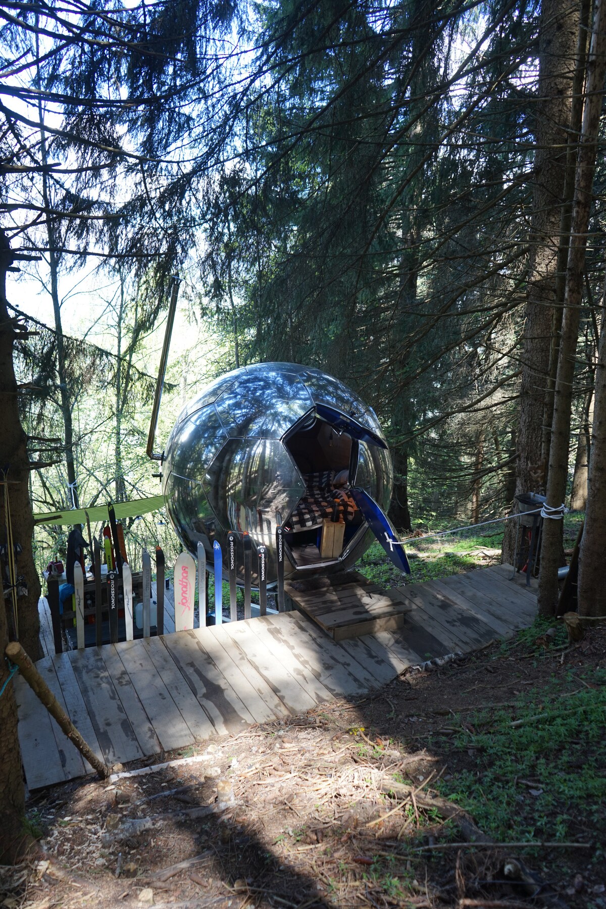 Elegantemente arroccata sulla sua terrazza in legno, la vostra bolla, vi permetterà di osservare la natura e ammirare il panorama sulla natura incontaminata. Al calar della notte, scoprite l'affascinante spettacolo della volta celeste. La vostra bolla è dotata di frigorifero, bollitore ( bustina di tè, tisana, caffè a disposizione), stoviglie per 2 persone, riscaldamento. Servizi igienici asciutti e necessari per un piccolo bagno all'interno dell'alloggio. Doccia privata all'esterno dell'alloggio.