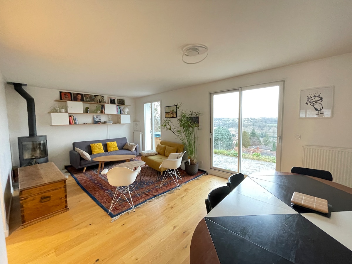 Nei Monts d'Or, un'area naturale a 15 minuti da Lione, sistemazione indipendente nella villa dove viviamo. Terrazzo privato e accesso palestra e sauna su prenotazione. Estate: piscina dalle 8:00 alle 10:00 e dalle 14:00 alle17:30. Vista sulla Saona. Sentieri escursionistici, gite in mountain bike. Ristoranti, Museo Demeure du Chaos, Guinguettes sulle rive della Saona. Ferrovie di Lione Perrache 12 minuti in treno (stazione ferroviaria 15 minuti a piedi), Part-Dieu 35 minuti in autobus.
