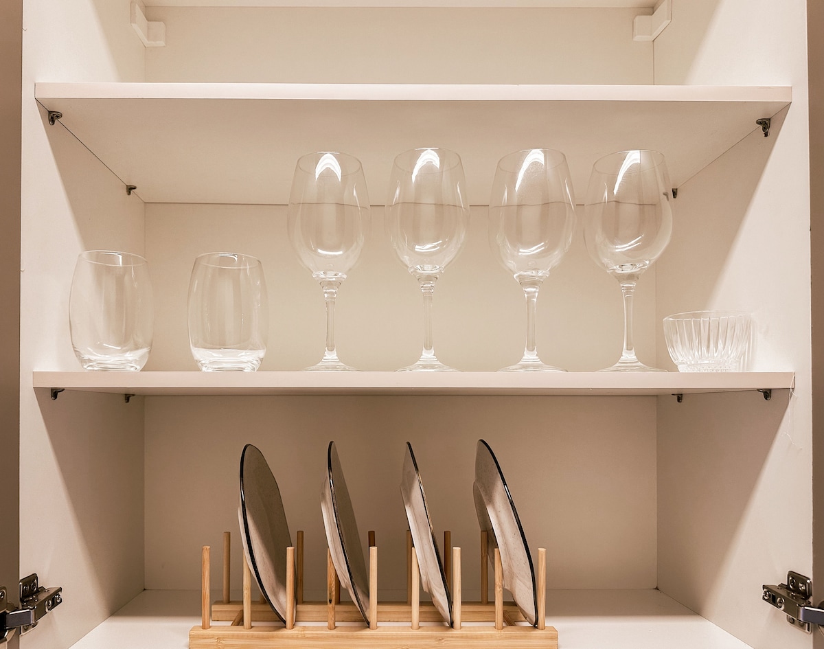L'appartamento dispone di 1 posto auto, internet; Smart TV; aria condizionata; letto matrimoniale; biancheria da letto e da bagno; 4 cuscini; divano; cuscini; area di lavoro; armadio; minibar; filtro dell'acqua fredda; piano cottura elettrico; tavolo da pranzo; forno elettrico; macchina per il caffè; tostapane; bollitore elettrico; utensili da cucina; asciugacapelli; ferro da stiro e sapone liquido. Accettiamo solo animali domestici di piccola taglia (fino a 6 kg), che devono essere inclusi nella prenotazione.