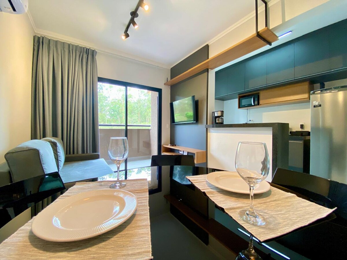 Nuovo e moderno monolocale situato nella zona più bella di Ribeirão Preto, dispone di Wi-Fi, aria condizionata, cucina completa, smart Tv 40', palestra BlueFit nell'edificio, Air fryer, posto auto e area ricreativa completa, piscina, sauna, sala giochi, spazio gourmet, spazio di coworking per lavoro, home market 24 ore su 24 e la migliore posizione della città, in Avenida Presidente Vargas a 3 minuti dal centro commerciale Ribeirão e vicino ai migliori parchi, bar e ristoranti di Ribeirão.