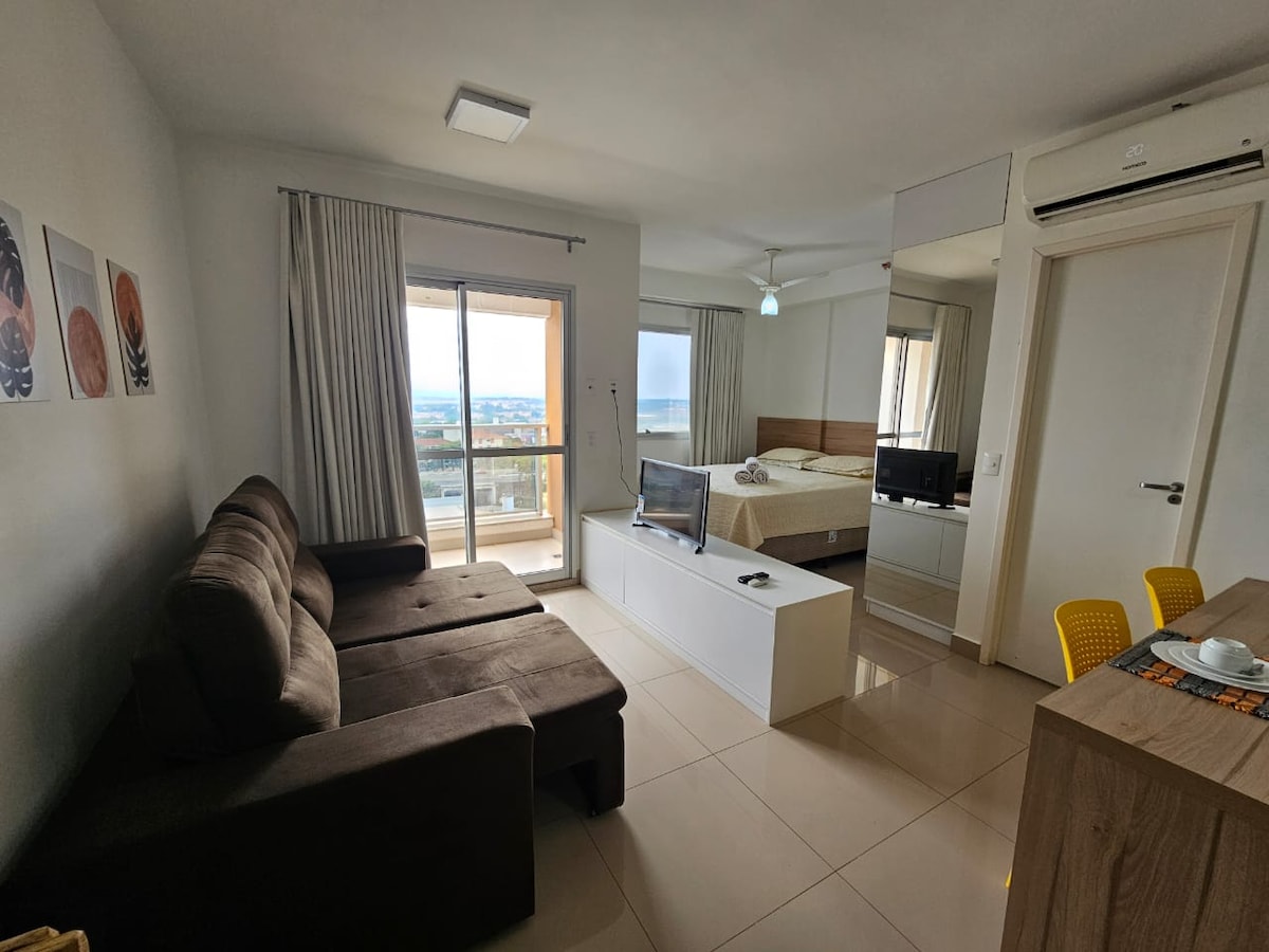Bellissimo loft nuovo di zecca, 28 m2 di grande intimità. Posizione molto facile da raggiungere, tra Shopping Iguatemi e Ribeirão Shopping, con un mercato accanto e una farmacia all'angolo. Vicino all'ospedale e alle cliniche Unimed, nonché all'ospedale regionale. L'ALLOGGIO L'appartamento Loft è molto simile a una camera d'hotel, con bagno, aria condizionata, cucina attrezzata, soggiorno con divano letto, panca da studio, asciugamani, biancheria da letto, coperte e piumone. Lavanderia collettiva e mini palestra.