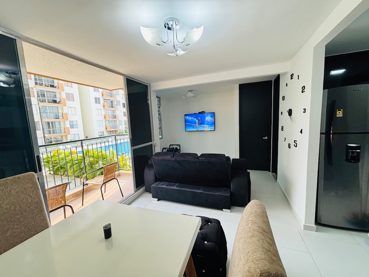 Magnifico apartamento con espectacular vista, completamente dotado. Dos habitaciones cada una con aire acondicionado. Wifi, Smart TV en sala y habitaciónes con las aplicaciones de Streaming (Ingresar con sus propias cuentas debido a las políticas de las plataformas), BBQ gas natural en balcón, hamaca. Conjunto con jacuzzi, piscinas, tenis de mesa, billar pool, futbolín, gimnasio. Complejo deportivo con canchas de tenis, futbol 5, cancha múltiple, parque infantil e iglesias