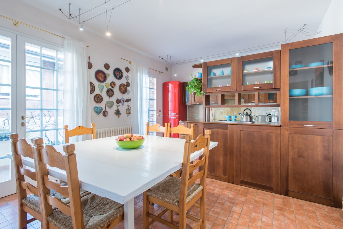 Camera rinnovata ed ampliata, annessa alla zona giorno con salotto e cucina creando un raffinato bilocale con ingresso indipendente, immersa nel verde, ma vicina alla città e a molti luoghi di, interesse. E' consigliato avere un mezzo di trasporto. Troverete una macchina del caffè espresso, the, biscotti e succhi di frutta. La casa dispone di un giardino di 4.000 metri che permette ai nostri ospiti privacy. Possibilità di self check-in/out. LICENZA Comune di Rimini 474 N.0134650