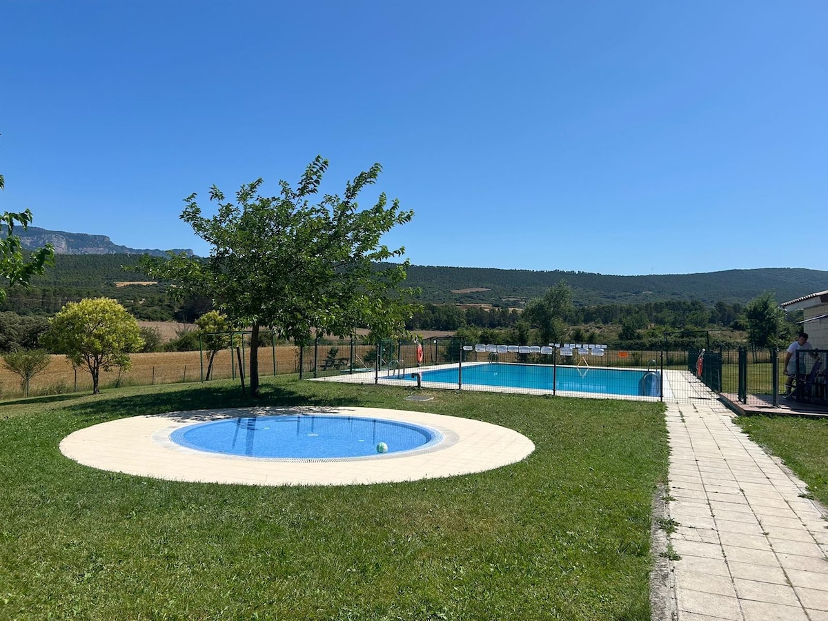Casa independiente de 2 plantas, muy amplia y luminosa, rodeada de la Sierra de San Juan de la Peña y a tan sólo 10-15’ de Jaca y 35'-45’ de las estaciones de esquí de Candanchú y Astún. Situada en el pueblo de Santa Cruz de la Serós, en una urbanización con piscina, zona ajardinada con parque infantil y fantásticas vistas a los Pirineos. Acogedora, tranquila, muy cuidada y totalmente equipada, es ideal para familias y grupos de hasta 6 personas. Admitimos mascotas.