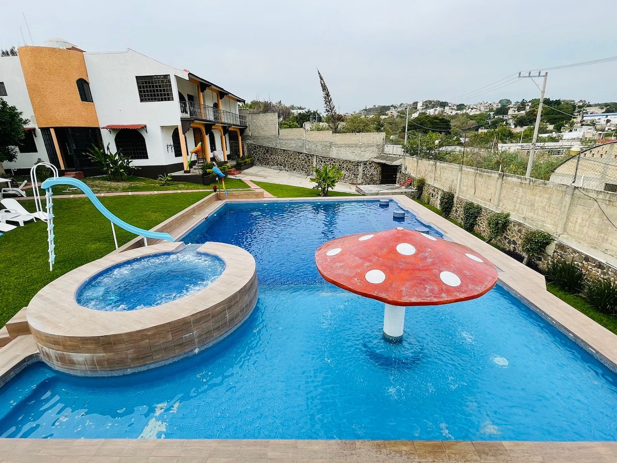 Incredibile casa a sud di Cuernavaca con un bellissimo e ampio giardino, piscina e piscina per bambini con riscaldamento solare privato, raggiunge i 20/28 gradi in inverno e in estate tra i 30/36 gradi; recinzione per la sicurezza di bambini e animali domestici. Palapa con smart TV da 55", con barbecue, forno e ampi spazi per divertirsi con la famiglia e/o gli amici. Parcheggio privato per 5 auto. Bagni con luce naturale e bagno principale con vasca idromassaggio privata. Vieni a rilassarti e goditi il clima e la natura