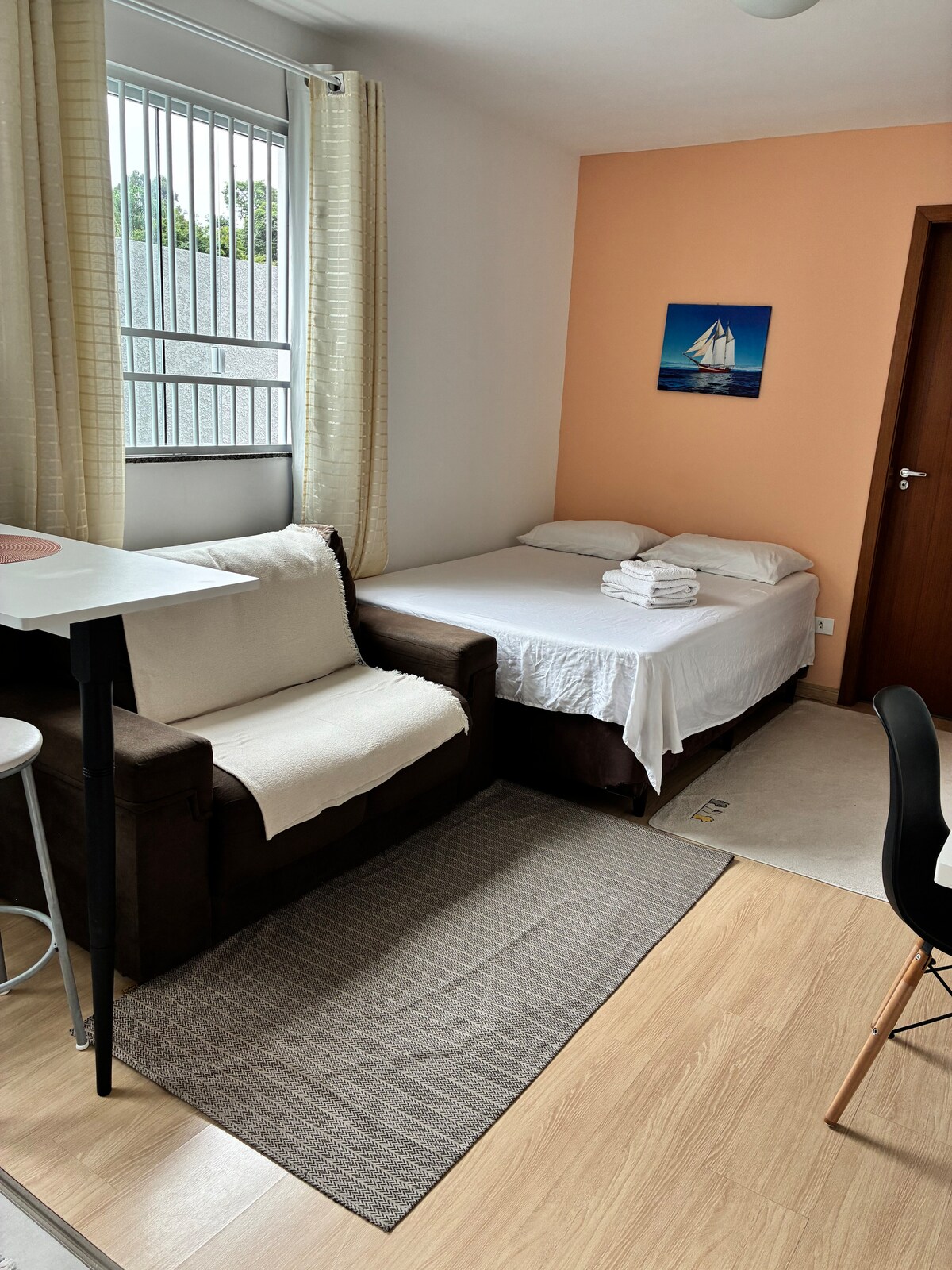 Equipado per un massimo di 3 persone, con 1 letto matrimoniale e 1 divano letto, un GARAGE COPERTO, self check-in, aria condizionata. (SÓFRIO) Som Ambient con Bluetooth, cucina completa, si trova in una zona privilegiata del quartiere, a 100 metri dalla fermata dell'autobus, vicino a una panetteria, a ristoranti, pasticcerie, bar, mercati, negozi all'ingrosso, stazioni di servizio, negozi Joquei, Unibrasil, a 6 km dal centro e vicino a BR 116-Line Verde, Hospital Vita, Expotrade, Hipica, ecc. Non è presente l'ASCENSORE, solo le scale.