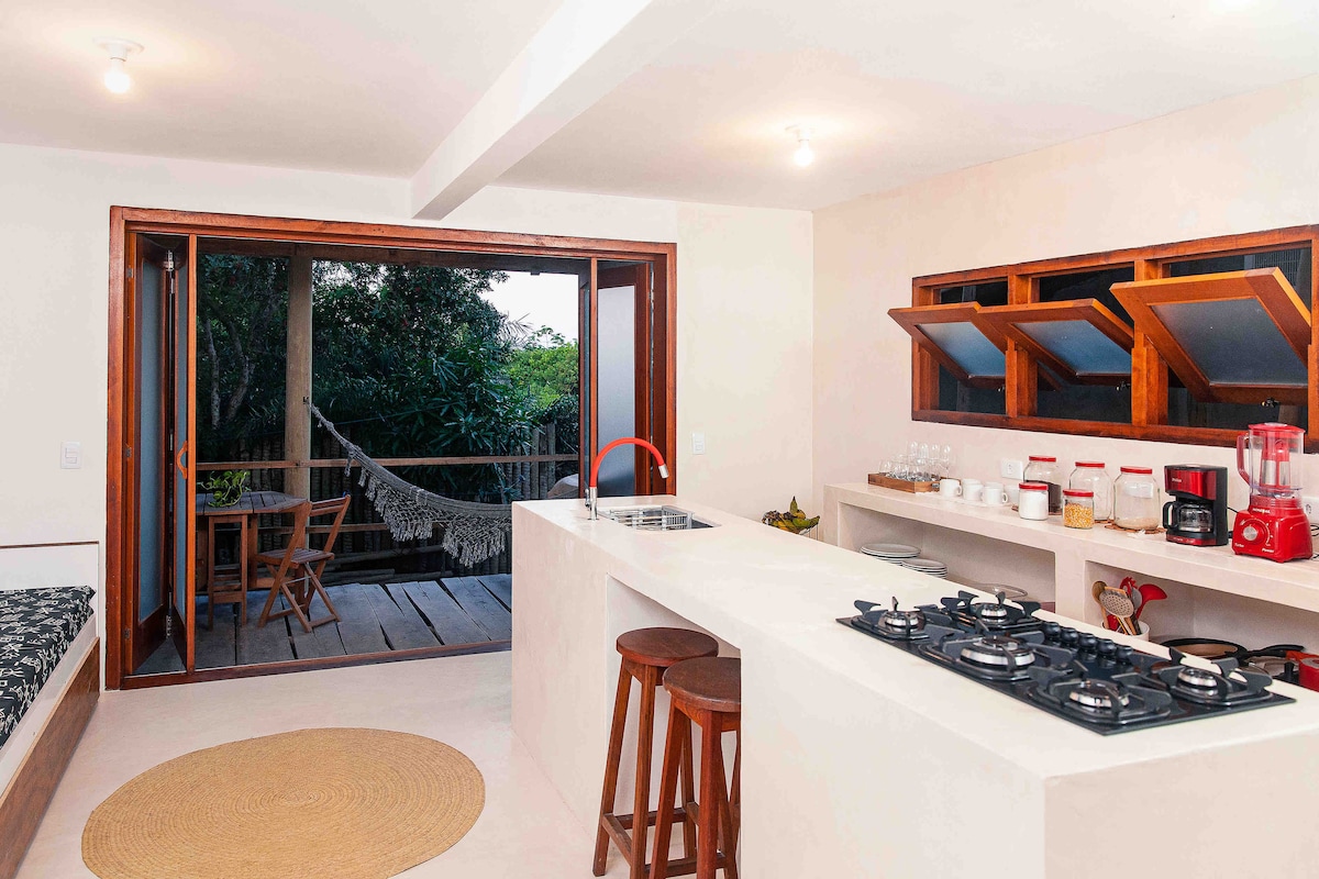 Progettato a forma di esagono, l'Arraia Bungalow combina la rusticità di un villaggio di pescatori con il lusso. Con la finitura in argilla di Taipa, che ricorda gli edifici del villaggio più antico del Brasile, il luogo cerca di rallentare e accogliere i suoi ospiti, facendovi sentire la pace e la leggerezza che il villaggio ha. L'alloggio si trova nella nostra pensione, che dispone di un cortile alberato e di un team pronto a soddisfare le tue esigenze.