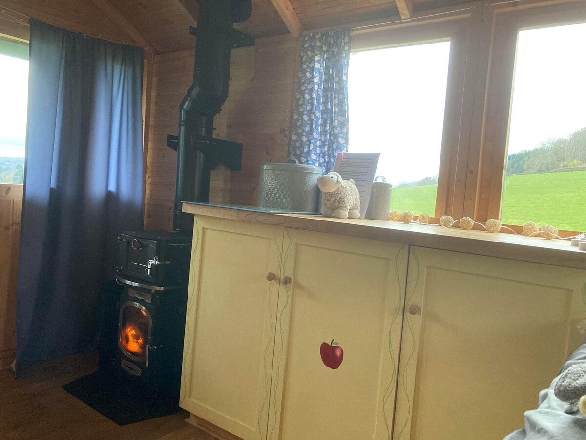 La nostra incantevole capanna per pastori color caprifoglio può ospitare due persone e si trova in un bellissimo frutteto nella campagna dell'Herefordshire. La capanna si trova in una fattoria funzionante, quindi vedrai molti animali tra cui mucche, maiali, polli e anatre. Dispone di un comodo letto matrimoniale, di una cucina e di un bagno privato con servizi igienici completi e doccia. È presente anche un accogliente caminetto a legna per le notti più fredde. La struttura vanta anche una vasca idromassaggio riscaldata a legna, perfetta per una fuga romantica di coppia in una posizione pittoresca.