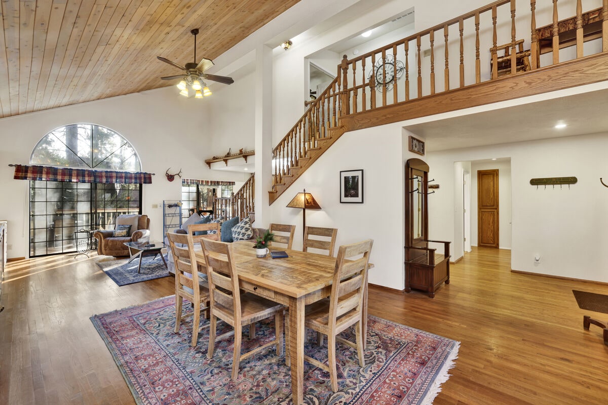 Casa recentemente ristrutturata con tutti i comfort immaginabili, tra cui vista sulle cime degli alberi, possibilità di andare a piedi a cena nel villaggio, di raggiungere a piedi il lago e di raggiungere in auto Snow Summit, Towne Trail e tutto il resto, che distano meno di 2 km. Cucina gourmet progettata per cucinare e intrattenere. Porte scorrevoli posteriori sul ponte con vista sulle cime degli alberi e sul lago... e se ti piace la musica, c'è anche il nostro pianoforte di famiglia... Ricarica a 240 V disponibile per la tua auto elettrica (NEMA 14-50).