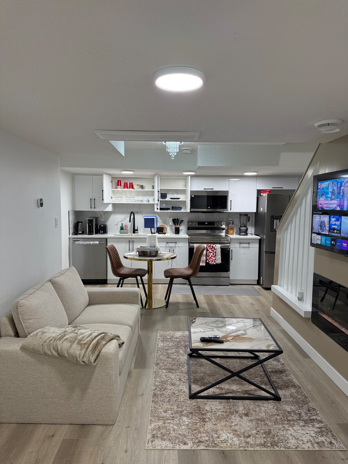 Modern private 1-bedroom basement suite with a separate side entrance in peaceful Trumpeter by Big Lake. Features a queen bed, cozy living area with Smart TV, high-speed Wi-Fi, fully equipped kitchen, and in-suite laundry. Free driveway parking and easy self-check-in. Minutes from West Edmonton Mall, shops, and major routes. Ideal for business travelers, couples, or solo guests seeking comfort, privacy, convenience, and a relaxing stay. Clean, peaceful, modern, and designed for comfort and ease.