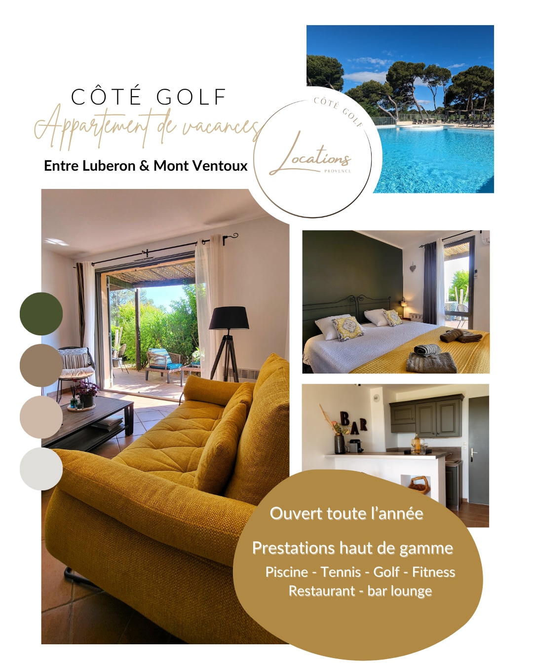 Grazioso bilocale di 32 mq, 4 persone sul Golf de Pont-Royal, aria condizionata, ristrutturato, composto da una bella loggia con una splendida vista sul campo da golf, una cucina attrezzata aperta sul soggiorno con 2 divani letto, una TV, un bagno con doccia, vasca, un WC separato, una camera da letto separata con un letto matrimoniale, una TV. Incluso nell'affitto: Wifi, biancheria da letto, da bagno, ingresso piscina incluso per luglio e agosto. Da aprile a fine giugno, gli ingressi in piscina sono a pagamento.