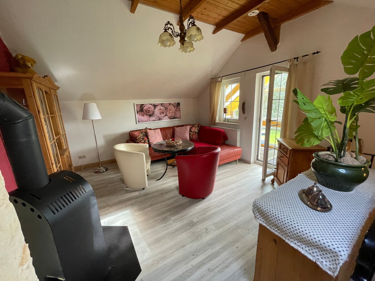 L'appartamento si trova a Ponitz, vicino al castello rinascimentale di Ponitz. Troverai un appartamento di tre camere in una storica casa del mulino. Può essere utilizzato da 2, 3 o 4 persone. Nel soggiorno c'è una galleria con due letti e, se necessario, aggiungiamo un letto per tre persone. Al piano di sotto c'è un letto per la quarta persona. È disponibile un lettino per i bambini più piccoli. La cucina è ben attrezzata ma non c'è il forno (solo i fornelli) e non c'è la TV (ma c'è il wifi). Troverai un bagno con doccia, asciugacapelli e asciugamani. È disponibile un parcheggio.