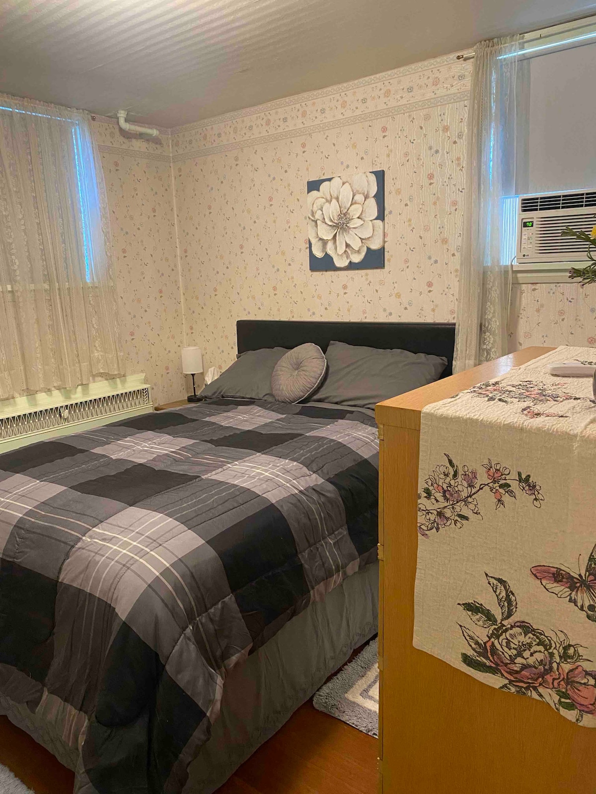 "No-frills" 1 Private Single bedroom with ensuite bath. Has 1 King size bed. This includes an ensuite bathroom with a shared laundry area with washer and dryer. This unit does NOT have access to any other area of the building, there is no access to a kitchen or living room. Situated down the street from a lovely park and within walking distance to the downtown area. Available for nightly rentals. You will be close to everything when you stay at this centrally-located place.