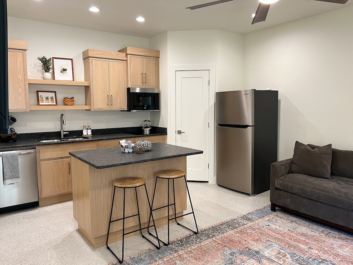Accogliente pensione con una camera da letto, cucina e lavanderia