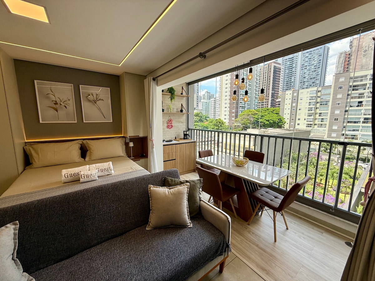 Esta acomodação elegante é perfeita para viagens a trabalho ou para eventos e shows. 🌆 Vista incrível no Morumbi! Desfrute da vista do São Paulo Surf Club e da Ponte Estaiada 🌉. Ar condicionado na sala e quarto, cama Queen e sofá-cama 🛋️. Ideal para home office 📚. Próximo a bares, restaurantes e ao estádio 🏟️. Fácil acesso ao aeroporto e hospitais 🚑. Perfeito para casais ou profissionais que buscam conforto e praticidade. TV 50” Ambilight + café Illy completo