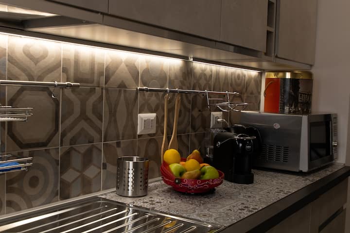 L’alloggio è fornito di biancheria da letto, set di asciugamani per ogni ospite, aria condizionata per un confortevole soggiorno anche durante i mesi estivi, impianto di riscaldamento autonomo, connessione WI-FI ultraveloce. E’dotato, inoltre, di ferro e tavola da stiro, stendibiancheria, kit di primo soccorso, estintore.