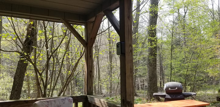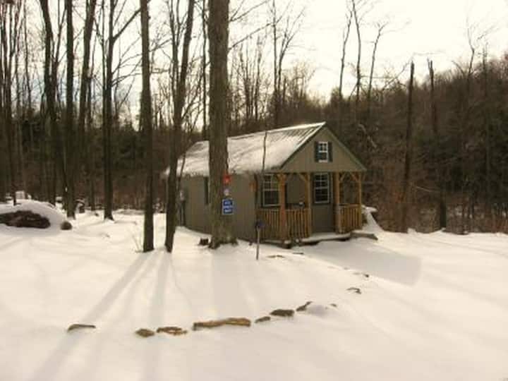 Cabin C si trova su una strada appartata in un ambiente privato, boscoso e bellissimo, a pochi passi dal torrente. Non ci sono impianti idraulici; ha riscaldamento, energia, illuminazione e un vasino portatile privato. All'esterno c'è un focolare privato e un tavolo da picnic, mentre una griglia a carbone e un piano cottura a propano sono disponibili gratuitamente.