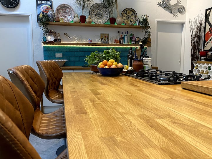 Entra e scopri un ambiente spazioso dove la creatività incontra il comfort. Il fulcro dello spazio è l'ampia cucina, dotata di tutto il necessario per creare capolavori culinari per due. L'ampio bancone per la colazione è in faggio massiccio e ospita il piano cottura a gas e gli sgabelli da bar, perfetti per cucinare e chiacchierare.