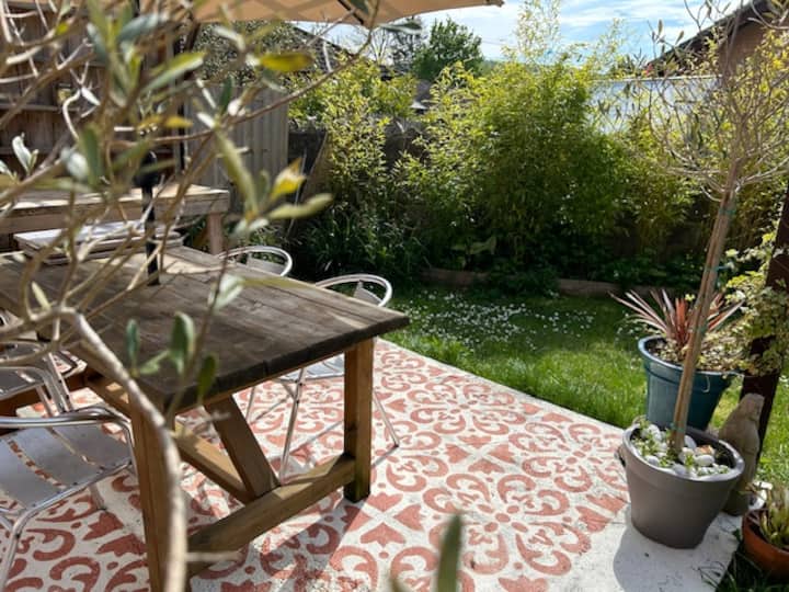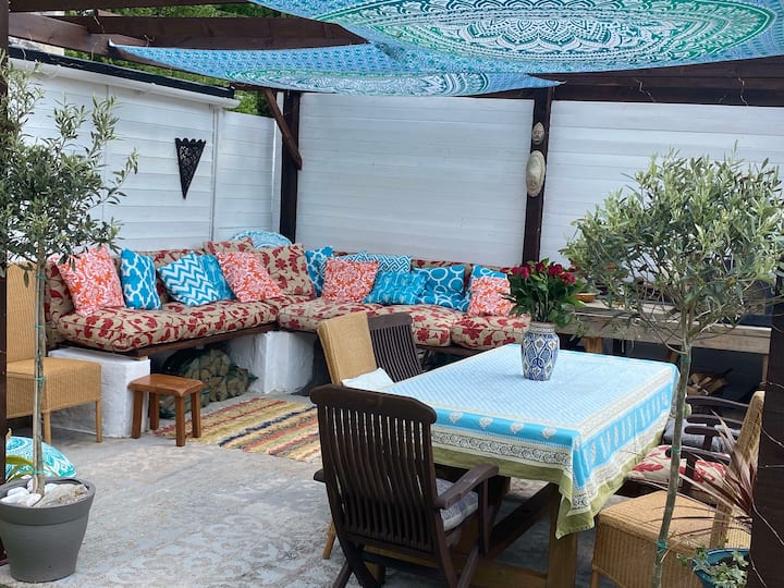 Attraverso due grandi porte a soffietto si esce nella propria oasi privata, dove un ampio terrazzo ti invita a rilassarti. Un piccolo prato conduce a un patio. È una trappola per il sole. Cena all'aperto al tavolo marocchino, circondato da una vegetazione lussureggiante e dalle erbe aromatiche del nostro giardino. Sotto il riparo di un'affascinante pagoda, sprofonda tra i morbidi cuscini del nostro patio in stile marocchino.