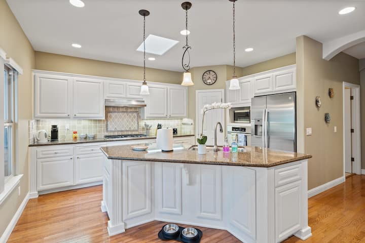 Completamente attrezzata con frigorifero, piano cottura, forno, microonde, macchina per il caffè e tutti gli elementi essenziali di base per la cucina: pentole, padelle, piatti, tazze e utensili. È presente un sistema di filtraggio dell'acqua per tutta la casa. L'acqua filtrata è disponibile da tutti i rubinetti e dal frigorifero!