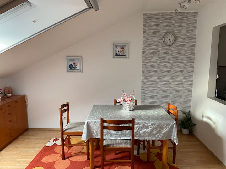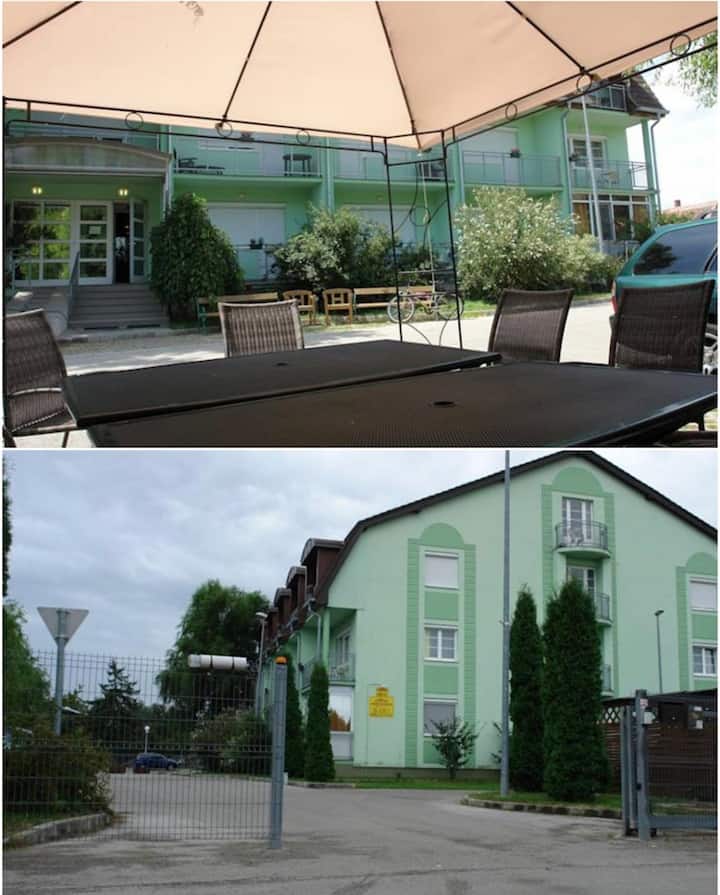 Situato alle spalle del Castello di Nádasdy e a 750 metri dalla Piscina e Spa Benessere. Il cortile è chiuso e si apre con un cancello elettrico, e il parcheggio è gratuito. In cucina: macchina per tè e caffè, tostapane, filtro acqua e bollitore, piatti, piatti, posate, canovacci sono a disposizione dei nostri ospiti. Il bagno dispone di asciugacapelli e sapone liquido. La camera è ampia, di circa 30 mq e la comoda zona pranzo dall'altra parte della stanza. L'appartamento è altrimenti riscaldato centralmente con un condizionatore d'aria di raffreddamento e riscaldamento.