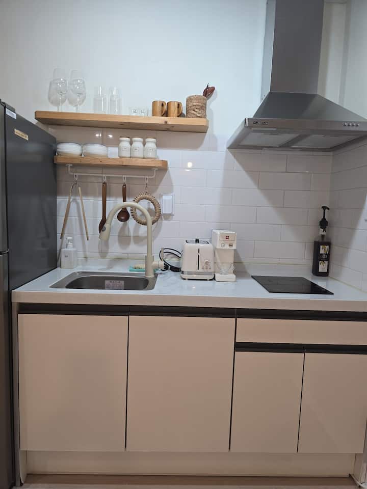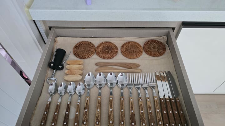 Utensili da cucina: pentole, set di stoviglie, induzione, forno a microonde, tostapane, frigorifero, lavello, tavolo da pranzo, proiettore, specchio, TV