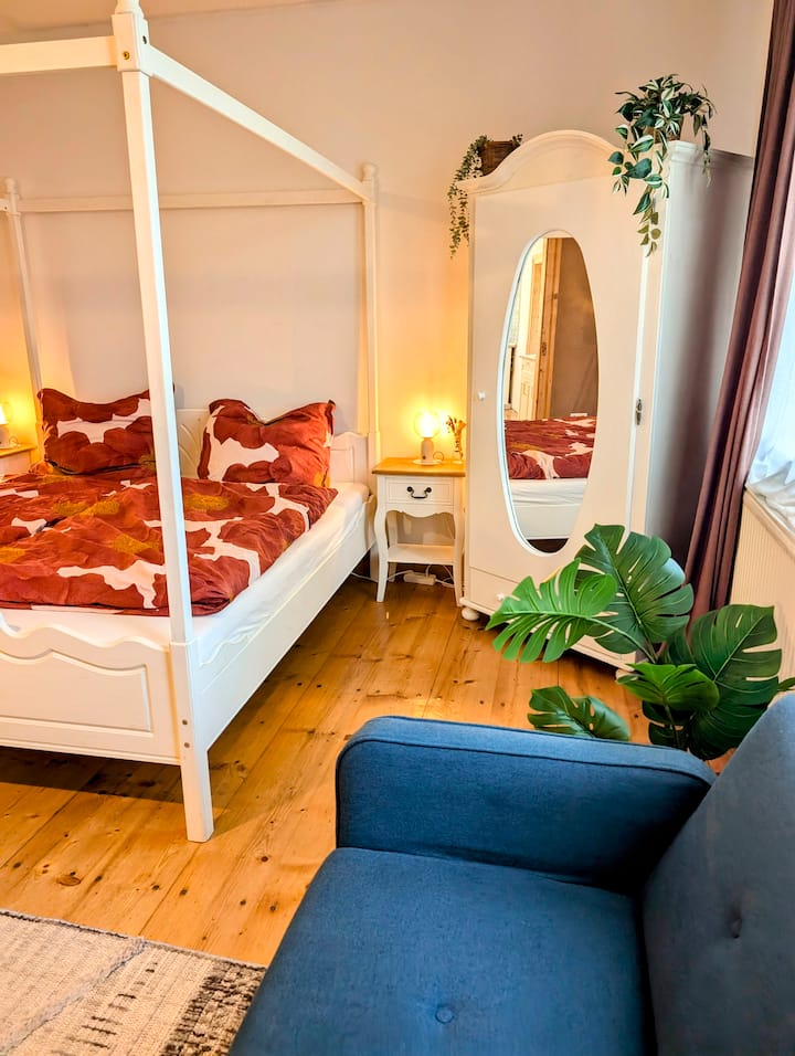 Lo spazioso soggiorno e camera da letto è dotato di un letto a baldacchino 180 e un armadio. Il divano può essere aperto fino a 120 cm e può servire come letto per un terzo ospite. Vengono fornite lenzuola.