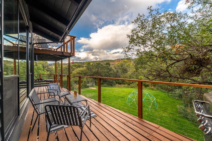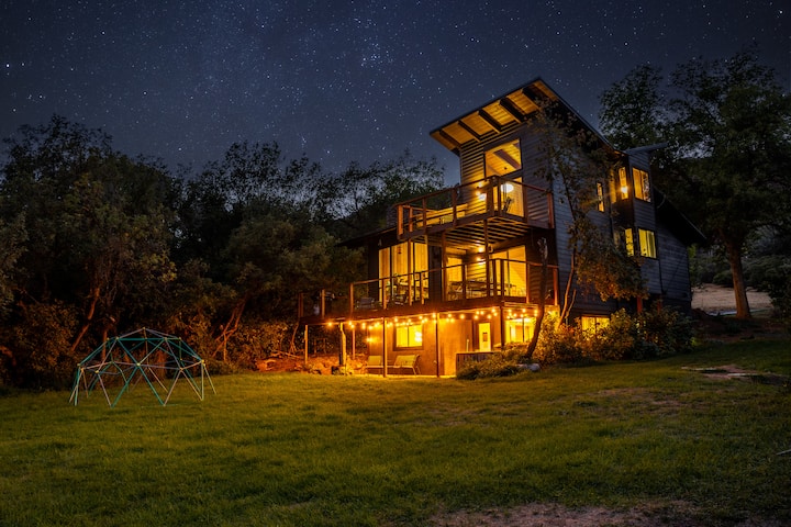 Immagina di immergerti in una vasca idromassaggio sotto il cielo di montagna, con Pac-Man che suona all'interno mentre i bambini giocano a biliardino, e cenare sul ponte mentre il sole scende dietro le colline. Questa è la nostra casa. Vissuta, amata e ora tua per goderne. Adatto ai cani, pieno di anima e costruito per vere vacanze.