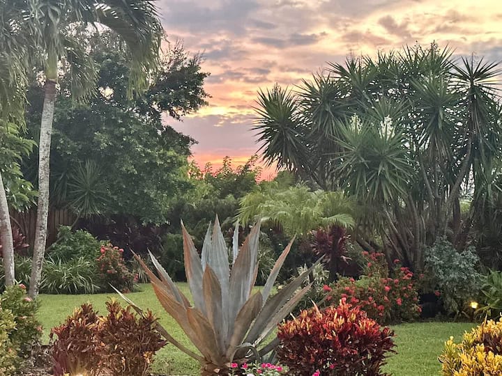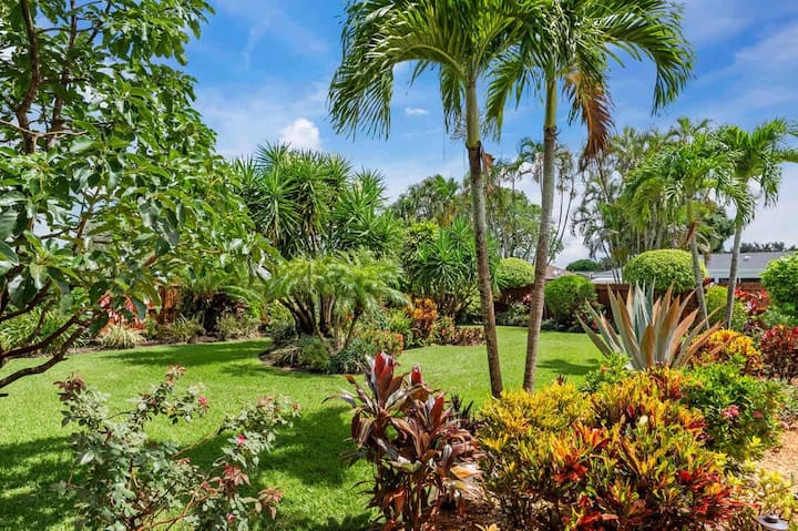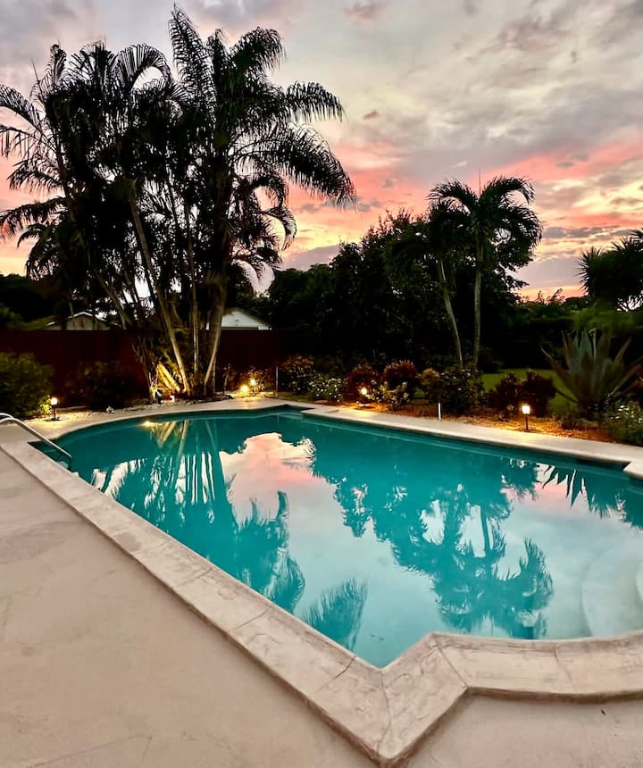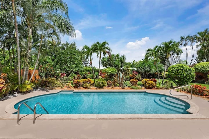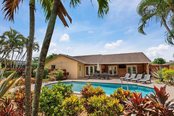 Casa con 4 letti e 2,5 bagni. Planimetria suddivisa: il lato con 3 camere da letto ha 2 letti king size e 1 letto queen size, 1,5 bagni, cucina e soggiorno; il lato con la suite principale ha una camera da letto matrimoniale, soggiorno, cucina, bagno completo e una piccola camera con 2 letti singoli, non considerata una camera da letto o uno spazio per dormire. Sala giochi: TV da 70", calcio balilla, air hockey, XBox360 e giochi da tavolo. Giardini mozzafiato, ping pong, cornhole, terreno recintato da 1/3 di acro, piscina di 9,75 m riscaldata con acqua salata, 9 smart TV, WiFi veloce, spiagge a 30 min, Lion Country Safari a 15 min, WEF a 7 min.