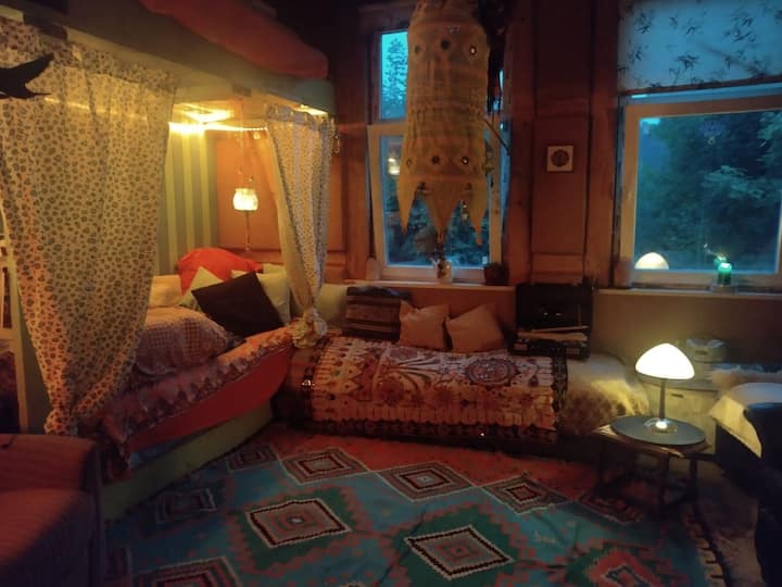 La casa è colorata, creativa, caratteristica, rimasta appesa negli anni '70 e piena di sabbia. È un pezzo unico artistico, arredato con molto amore, soffice e confortevole.