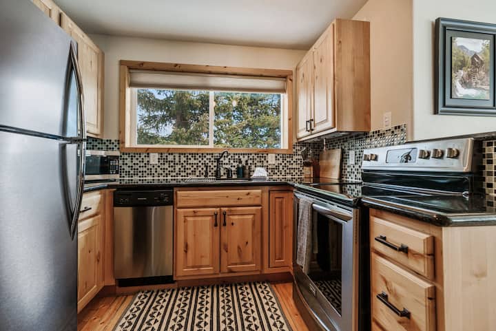 Entrando in casa, si viene accolti dall'aria ariosa e aperta di alti soffitti a volta, lavori in pietra personalizzati e spazi unici. L'ampio ingresso offre molto spazio per lasciare cadere la tua attrezzatura da avventura, così potrai sistemarti e rilassarti. In fondo al corridoio fino alla cucina ben attrezzata, godrai di una splendida vista sulle montagne attraverso l'ampia finestra sopra il lavandino e la zona cottura è dotata di tutto il necessario per preparare un pasto preferito. L'architettura distintiva di questa casa offre una meravigliosa esperienza in alta montagna, con una stufa a legna su un grande focolare in pietra, un soggiorno a pianta aperta con comodi posti a sedere centrati sulla smart tv e sulla sala da pranzo, il tutto impreziosito da arredi Mountain Modern. Goditi comodi posti a sedere per 4 al tavolo della sala da pranzo, con incredibili viste sulle montagne.