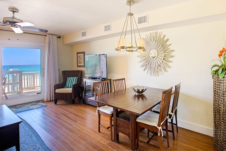 Appena entrati nella Shoreline Villas #14, noterete gli splendidi piani di lavoro in marmo bianco. Troverai anche elettrodomestici di alta gamma, spazi pensili perfettamente studiati e un'illuminazione da bar unica. Entrando nel soggiorno noterai una grande TV a schermo piatto, una grande e confortevole area salotto e altre splendide opere d'arte in tutta la casa. Attiguo al soggiorno c'è il balcone che si affaccia sulla spiaggia, con scale private che conducono alla spiaggia. È un'area salotto perfetta per i genitori, dove i genitori possono godersi la limonata ghiacciata mentre tengono d'occhio i bambini che fanno castelli di sabbia sulla spiaggia. Sotto la terrazza troverete un porticato con un grande tavolo, una griglia a gas e una doccia esterna.