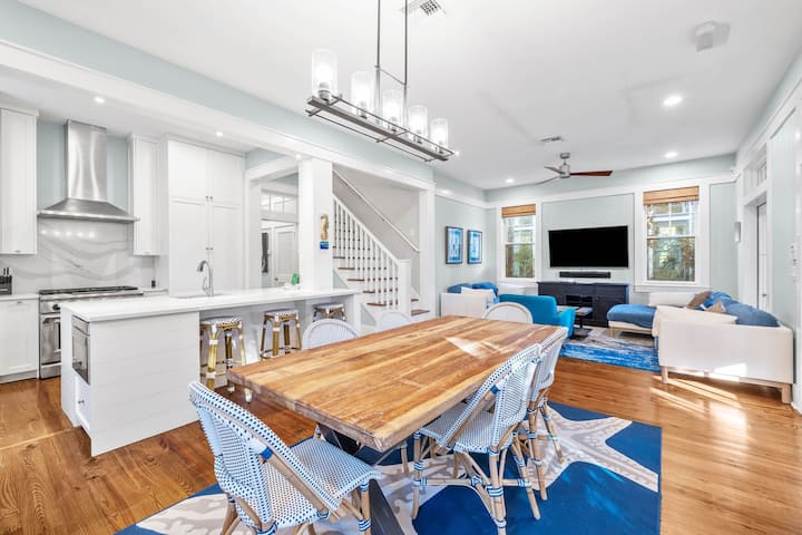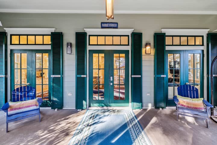 Infuso di fascino, questo splendido bungalow a 2 piani accoglie gli ospiti con un ampio portico anteriore arredato con Adirondack e sedie a cestino appese. All'interno, pavimenti in legno massello di miele e pareti blu pastello adornano la sala principale. Un morbido divano a forma di L, un divanetto e una poltrona circondano una Smart TV da 65"nel soggiorno, mentre un tavolo da pranzo con 6 sedie in rattan in stile parigino e un bar si trova di fronte. Lo spazio della cucina nell'angolo posteriore presenta elettrodomestici di fascia alta, un bar per la colazione a 3 utensili e una disposizione aperta per divertirsi senza intoppi. In fondo al corridoio, il portico posteriore schermato incoraggia la sala da pranzo all'aperto con un tavolo da 6 posti e offre il massimo dell'accogliente angolo lettura con divano letto rotondo. Circondato da una vegetazione lussureggiante, il rifugio sul retro include una piscina, un'area salotto, una doccia all'aperto e una cucina all'aperto. Trascorri le giornate di sole a sguazzare in piscina o sdraiati sui lettini. Sotto il pergolato, i ventilatori a soffitto offrono una piacevole brezza mentre gli ospiti si riuniscono sul divano curvo del patio per le serate all'aperto o per guardare la TV. Adiacente si trova la cucina all'aperto e la griglia, con un tavolo in stile picnic per scavare nel barbecue. Quando arriva l'ora di andare a dormire, ritirati nella camera da letto principale con un letto matrimoniale grande o nella camera degli ospiti con un letto matrimoniale, ognuna con accesso al portico con zanzariera e una Smart TV su questo livello. Per i viaggi prolungati, l'armadio della hall dispone di una comoda lavatrice e asciugatrice impilate.
