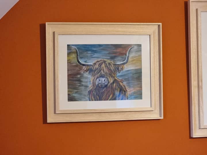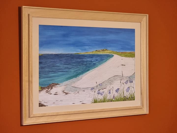 Le scale hanno una bella passatoia in lana, morbida sotto i piedi, con aste per tappeti a forma di cardo! La finestra ha un profondo sedile con i nostri cuscini e plaid in tweed intrecciati a mano, perfetto per un accogliente angolo di lettura. La tromba delle scale è decorata con uno dei nostri paesaggi marini tessuti a mano raffiguranti una tranquilla giornata estiva con rose marine su una scogliera erbosa che si affaccia su una spiaggia verso il mare e il cielo. Il resto delle pareti è una galleria dei miei mini dipinti originali, che gli ospiti potranno acquistare, se lo desiderano.