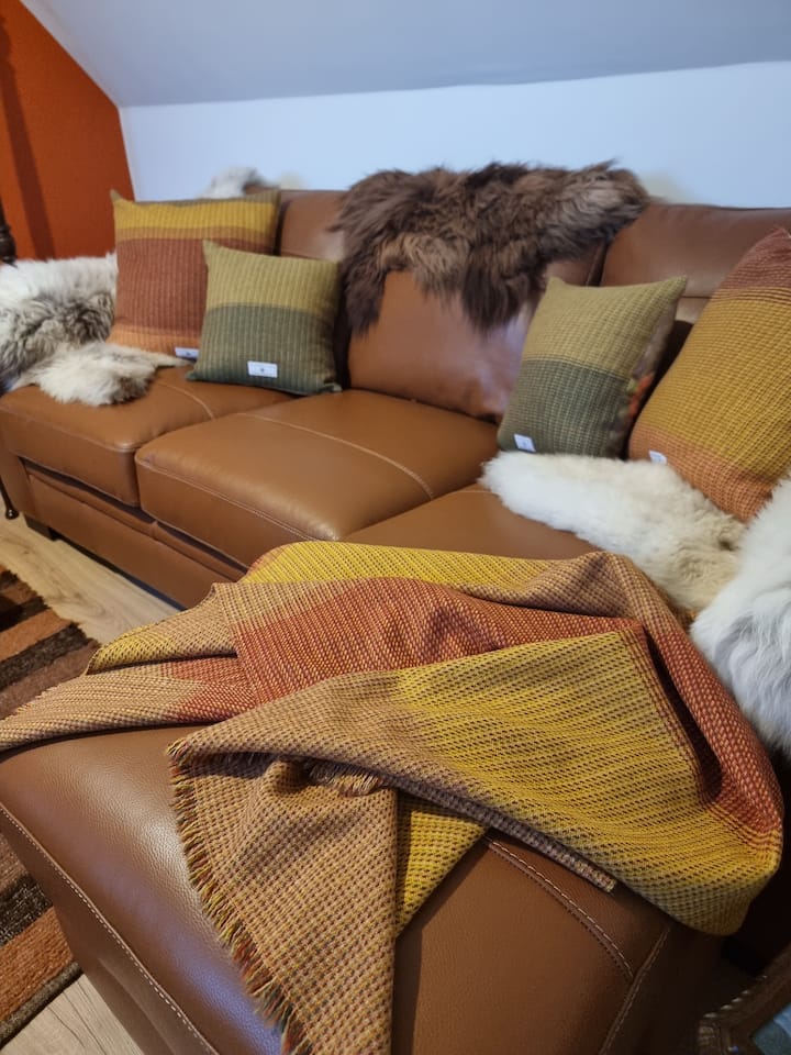 Anche il soggiorno è al piano di sopra, dove si trova una scrivania d'epoca riciclata che ho dipinto con un paesaggio marino e una sedia d'epoca rivestita con il nostro tweed. Perfetto per il lavoro che non può aspettare fino a quando non torni a casa! Accanto, una credenza vintage con libri, giochi e puzzle. Il soggiorno ha un divano a tre posti con chaise longue a un'estremità e una poltrona, entrambi in splendida pelle marrone. Sono ricoperti di pelli di pecora, coperte intessute a mano e cuscini per uno spazio rilassante e decadente. L'opera d'arte è tutta originale dipinta da me. I tappeti sul pavimento sono stati tessuti a mano da noi su un telaio in legno. Il camino è puramente decorativo, nella sua posizione originale con piastrelle vittoriane, il nostro tweed al centro e il legno riciclato che lo circonda. Il mantello è un'azalea africana di 180 anni che pensiamo fosse probabilmente parte di una nave, poi smantellata o recuperata e usata in una casa, poi usata come palo di recinzione prima di essere riutilizzata di nuovo!