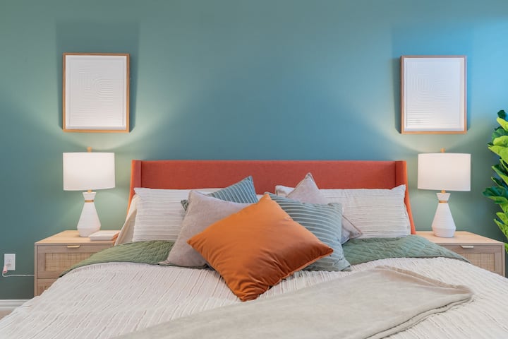 Ritirati nella camera da letto principale e rilassati su un lussuoso letto king-size con biancheria da letto di alta qualità. Goditi i tuoi programmi preferiti sulla smart TV a grande schermo e non dimenticare di impostare la sveglia sull'orologio da comodino, che offre comodamente porte di ricarica per caricare i tuoi dispositivi elettronici per la giornata di divertimento che ti aspetta!