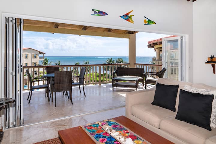 Bilocale con vista sull'oceano, piscina, spiaggia e ampio balcone