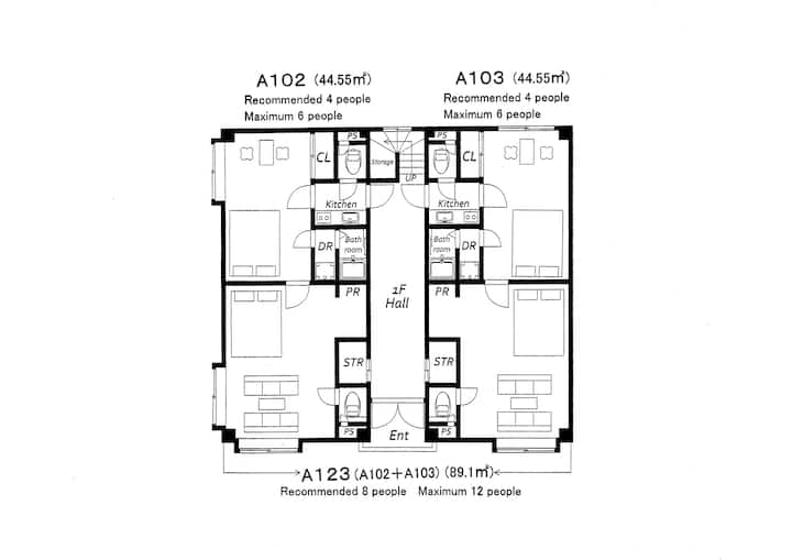 A103/max 6 persone/2 camere da letto/2 bagni/Wi-Fi gratuito/44 m²/ + A102 per un totale di max 12 persone 4 camere da letto
