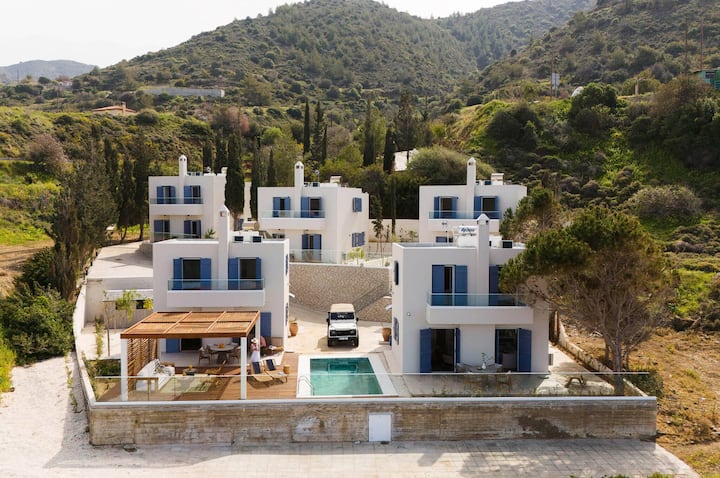 Gli ospiti hanno pieno accesso alla loro villa privata, che comprende due camere da letto, una cucina completamente attrezzata, soggiorno e zona pranzo, un bagno, un WC per gli ospiti e una terrazza privata con vista sul mare. Tutti gli ospiti condividono l'accesso alla piscina a sfioro, ai lettini prendisole e all'ingresso diretto sulla spiaggia. Per prenotazioni di intere proprietà, tutte e cinque le ville e gli spazi condivisi sono a tua esclusiva disposizione per tutta la durata del soggiorno.