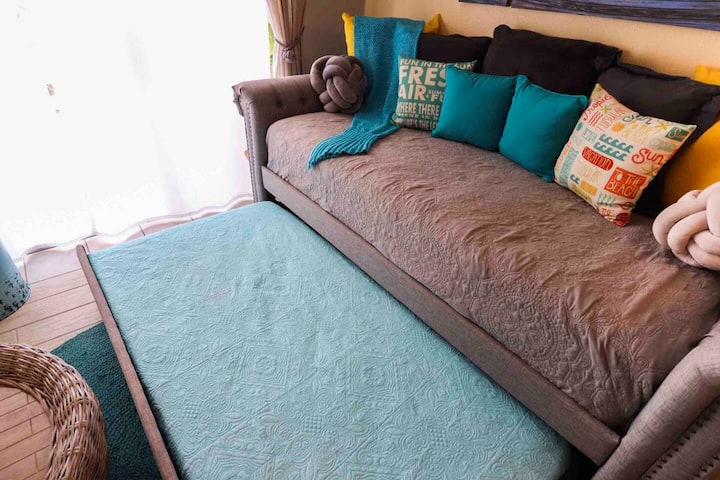 Il soggiorno dispone di un divano letto con un materasso matrimoniale sulla parte superiore e un letto estraibile con materasso singolo sulla parte inferiore, che può ospitare comodamente due persone.