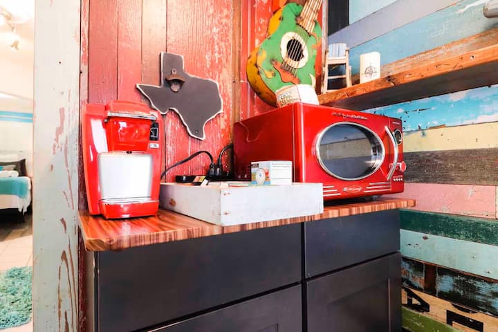 Avrai anche una cucina completa, tra cui un mini frigorifero (nota che questo è l'unico frigorifero ed è compatto), un piano cottura a due fuochi, forno a microonde, mini lavastoviglie, Keurig e lavello. Ho rifornito la cucina con le pentole e le stoviglie essenziali per preparare semplici pasti casalinghi durante il soggiorno.