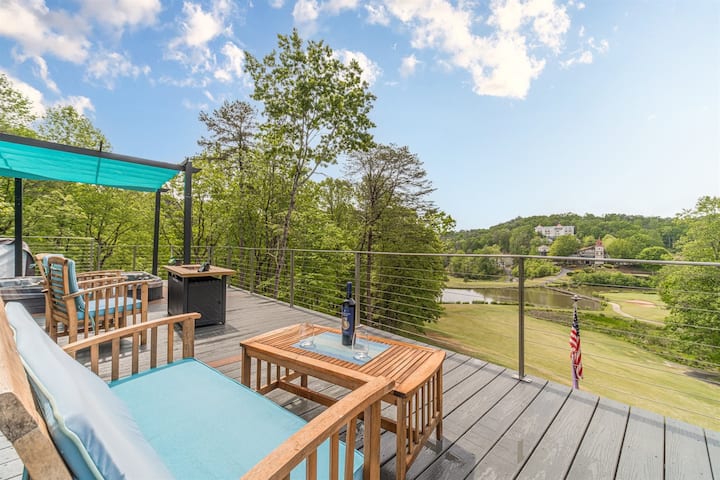 Al piano principale, ci sono anche le due camere da letto principali, una camera da letto matrimoniale California king con un'oasi di bagno con parete art déco personalizzata, doccia a pioggia con vaporizzatori, vasca da bagno con bombe da bagno, doppio lavabo e una toilette separata. Dall'altra parte della casa c'è una camera da letto matrimoniale con bagno privato, con un altro doppio lavabo e una doccia a pioggia con vaporizzatori! Al piano superiore, ci sono altre due grandi camere da letto e bagni completi. Una con due letti singoli, ideale per bambini o adulti che dormono separati, e un bagno privato con doccia e vasca. Dall'altra parte del soppalco, c'è la seconda camera da letto matrimoniale con bagno completo e doccia a pioggia. Scendendo al piano interrato, c'è un'enorme sala giochi con un cinema, un altro bancone personalizzato per giocare a giochi da tavolo o a poker! Il minifrigo e il forno a microonde al piano di sotto sono perfetti per mantenere le bevande fredde e preparare i popcorn per una serata di film. Il pezzo forte della stanza è un tavolo da biliardo in ardesia di dimensioni standard con tutti gli accessori! Il divertimento non finisce qui, con una sauna a infrarossi per tre persone con altoparlante Bluetooth, lampade di sale e illuminazione cromoterapica. Ma aspetta, c'è dell'ALTRO! Questo chalet ha anche qualcosa per chi vuole rimanere in forma in vacanza (magari bruciare quel pretzel in città!), una palestra a tre pezzi con una cyclette, una panca per pesi liberi e una macchina per esercizi tutto in uno! Guarda i tuoi programmi preferiti mentre ti alleni sulla smart TV in palestra o goditi la vista sul campo da golf dalle grandi finestre! Al piano seminterrato è disponibile un bagno completo con tre pezzi e doccia a pioggia. Esci dalla sala giochi sul terzo ponte di questo cottage che dispone di comodi mobili da salotto e di un dondolo per due persone per rilassarti al mattino o alla sera con le tue bevande preferite! Se hai ancora bisogno di più spazio, abbiamo una quinta camera da letto fuori dalla sala giochi con un letto a castello XL e un letto singolo aggiuntivo disponibile. Questa può essere utilizzata come stanza di blocco per risparmiare sul soggiorno se non è necessaria per il tuo gruppo.