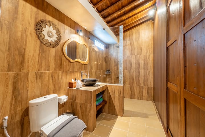 La villa familiare standard offre una vacanza ideale per famiglie o amici. Ogni villa in legno di 9×10 m dispone di due camere da letto separate di 5×5 m con bagno privato, ingressi privati, porta comunicante e terrazza anteriore. Le ville si trovano a 3 metri di distanza tra giardini lussureggianti, con ventilazione naturale e arredi balinesi per un'atmosfera tranquilla. Dalla terrazza, goditi la vista sul giardino e sull'oceano. All'interno, aria condizionata, Wi-Fi gratuito, scrivania e minibar. Sono disponibili due ville. Non vediamo l'ora di ospitarti!