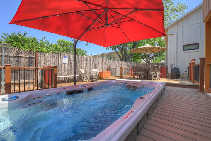 Esci e scopri la tua oasi privata. La terrazza posteriore coperta conduce a una spa acquatica dove è possibile immergersi o sguazzare in totale comfort. Rilassati giocando a cornhole la sera o guarda la partita sulla TV all'aperto, il tutto mentre ti godi la tranquilla aria della Hill Country.