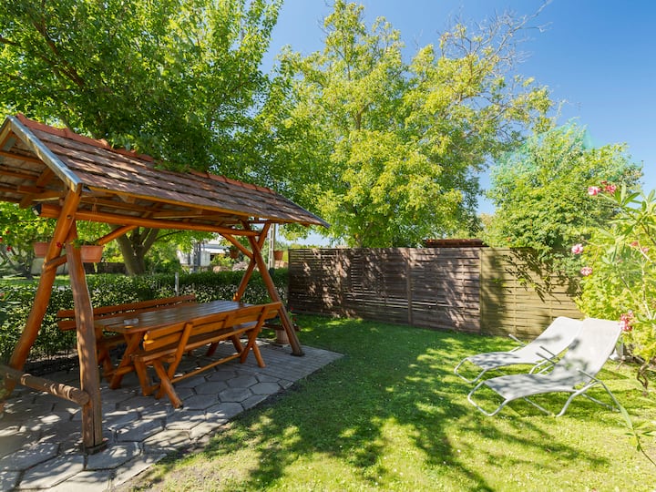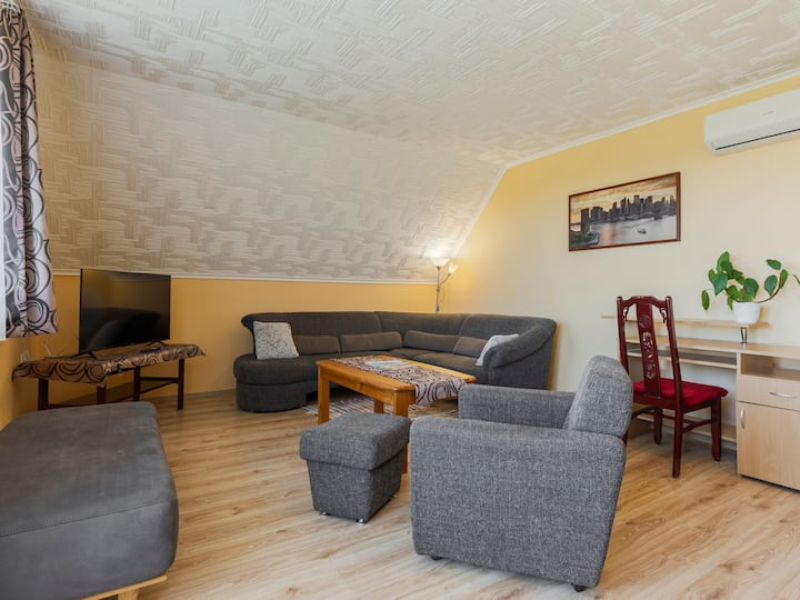 Balatonfenyves, a 25 km da Keszthely: confortevole casa bifamiliare a 2 piani, ristrutturata nel 2022. 2 appartamenti nella proprietà. Nel resort, nel quartiere residenziale, a 700 m dal lago e a 1,6 km dalla spiaggia. Privato: proprietà (recintata), piccolo giardino. Mobili da giardino, barbecue. In casa: WiFi, aria condizionata, lavatrice. Parcheggio (per 2 auto) presso la casa. Negozio di alimentari a 200 m, supermercato a 1,5 km, noleggio biciclette a 1,5 km, spiaggia erbosa a 800 m, bagni termali "Csisztapuszta" a 13 km. Tennis 1 km, maneggio 1,8 km, pista ciclabile 500 m, parco giochi per bambini 1 km. Attrazioni nelle vicinanze: Kereki Dino Park 47 km, Centro visitatori Kis-Balaton 20 km, Castello Festetics 27 km, Ruota gigante di Keszthely 27 km, Tenuta vinicola Kristinus 14 km, Terme di Hévíz 32 km. Il proprietario vive in una casa bifamiliare separata.