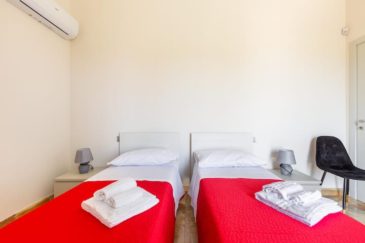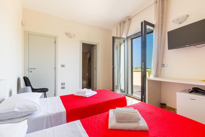 La camera doppia sorge al primo piano di Agriturismo Cutura. È arredata con 2 letti singoli, comodini, armadio, tv e mini frigo.
