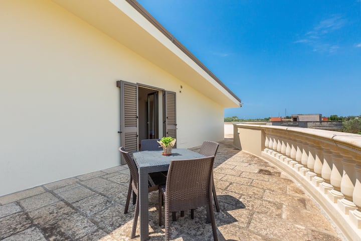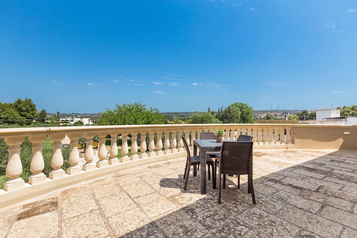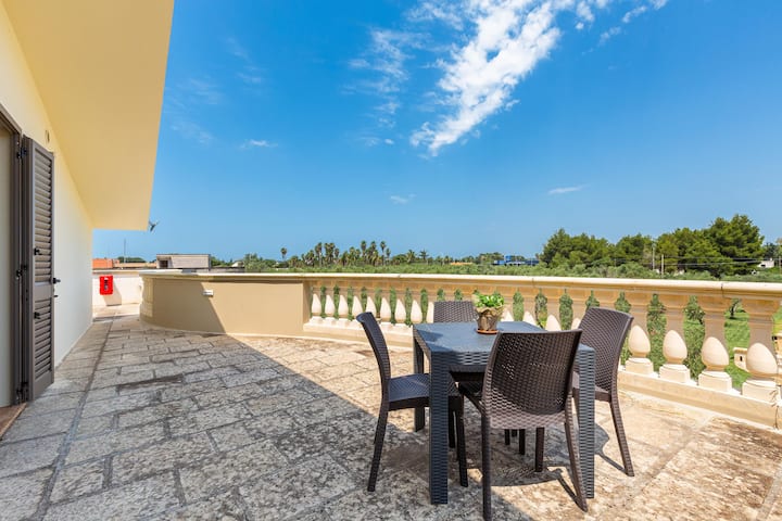 La camera doppia con terrazzo e vista panoramica è ideale per due persone in vacanza nel Salento, nella natura della campagna di Parabita, molto vicina a Gallipoli.