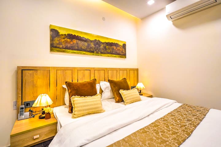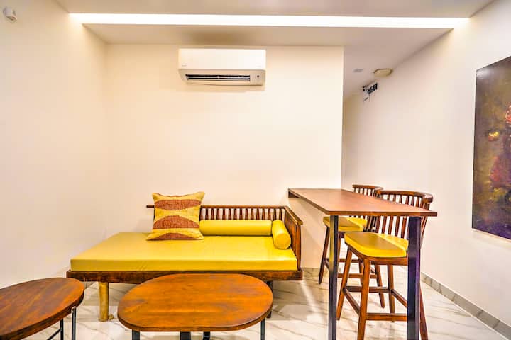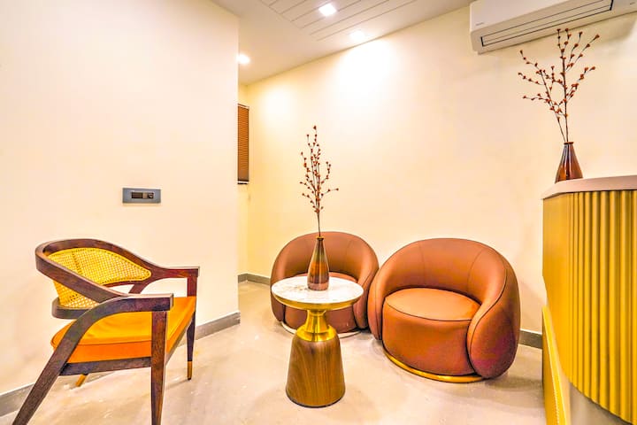 Rilassati in un ampio spazio di 23 metri quadrati. Suite Junior 1RK con zona giorno, angolo cottura e Wi-Fi superveloce a 200+ Mbps. Bagno moderno e boho, accesso con ascensore e comfort dell'hotel ti aspettano al Jeffyotels Urban Oasis, un'oasi unica e tranquilla a sud di Delhi. Prenditela con calma in questo alloggio unico e rilassante.