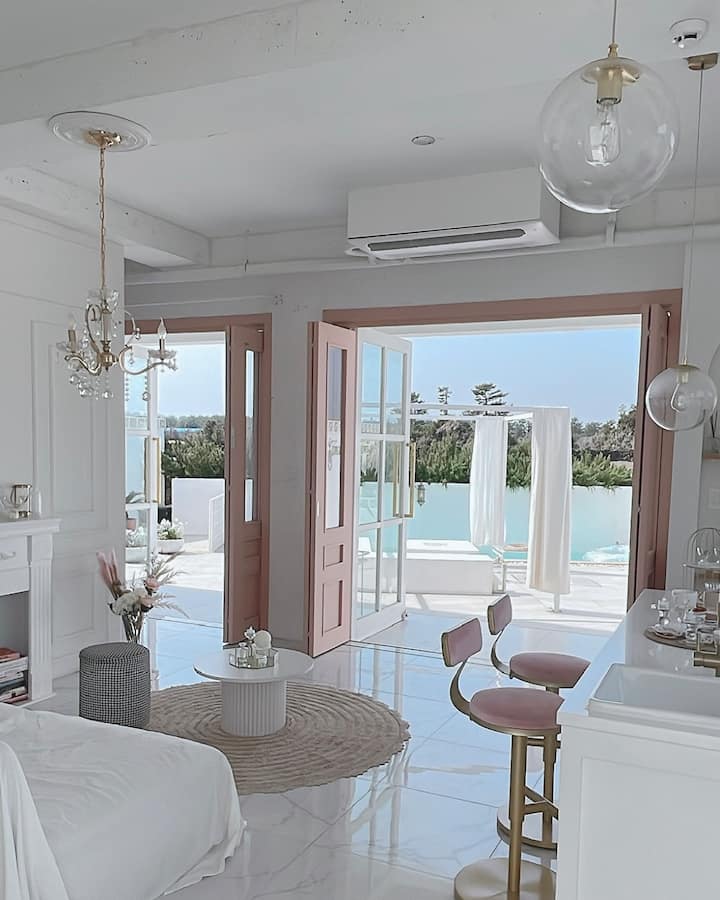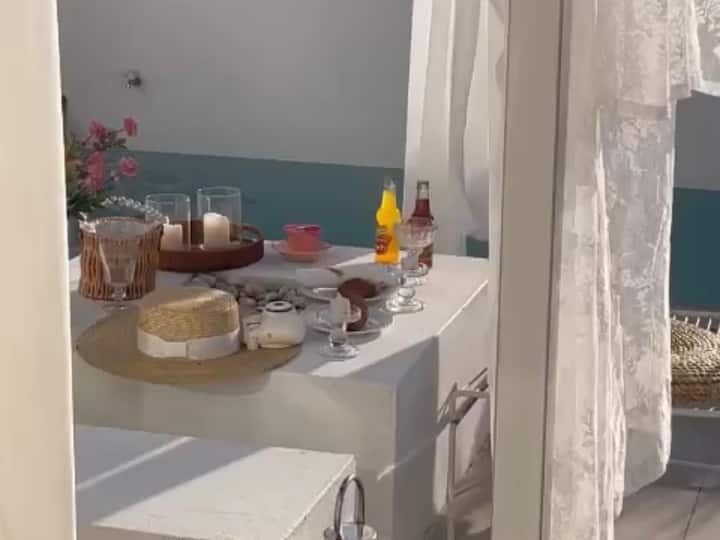 Casa bianca famosa per la sua bellezza, vicino alla spiaggia di Sehwa, con il suo mare color smeraldo