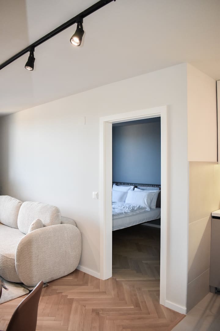 Questo nuovissimo appartamento moderno è il tuo santuario per il relax. Abbiamo pensato al tuo comfort, garantendoti una notte di sonno perfetta con un materasso premium e tende completamente oscuranti.